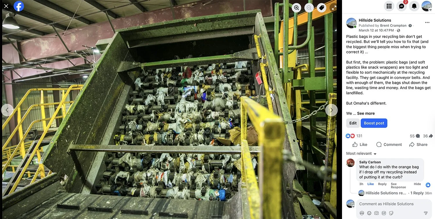 The blog posts are indexed by search engines. Anyone in Omaha searching for Hefty Renew, orange bag recycling, or soft plastic disposal will find Hillside's guide — not Hefty's generic national page, but the Omaha-specific version with local details that Hefty's own site gets wrong.